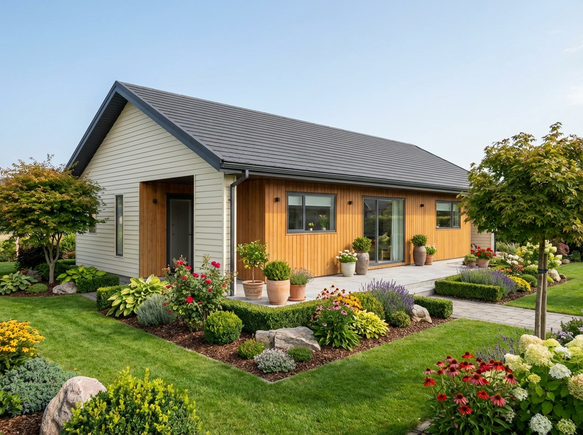 외관은 세라믹 사이딩과 세라믹 평기와 지붕으로 마감되어 차분하고 따뜻한 이미지를 완성하며, 우드 톤 포인트와 깊은 처마는 자연과의 조화를 강조하며, 독일식 시스템 창호는 단열과 기밀성을 높여 쾌적한 실내 환경을 유지합니다.