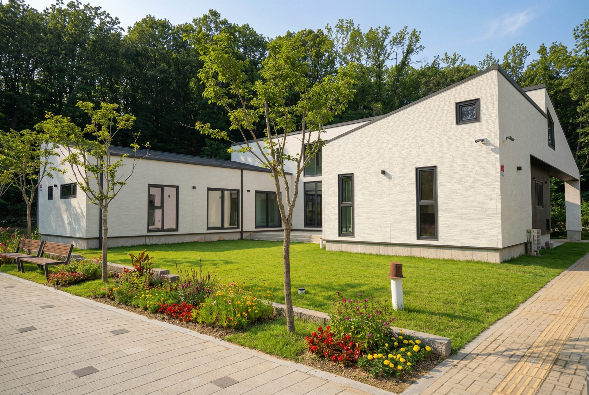 푸른 숲이 둘러싼 대지 위, 두 채의 집이 서로를 바라보며 나란히 서 있습니다.